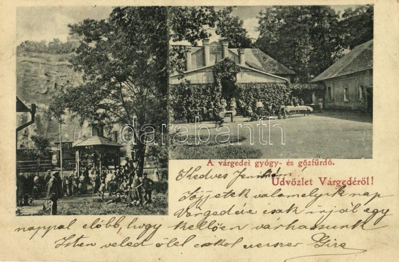 Beschreibung: 1901 Várgede, Hodejov; Gyógy- és gőzfürdő, kút, vonat a háttérben / spa, well, train in the background + "FÜLEK-MISKOLC 41. SZ" mozgóposta