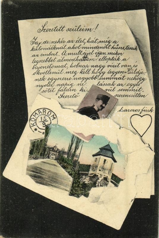 1914 Komárom, Komárnó; Kőszűz, várkapu. Montázs levéllel és katona arcképével, Spitzer Sándor kiadása / statue, castle gate. Montage with letter from a soldier