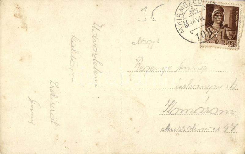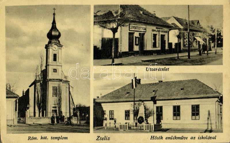 1944 Zselíz, Zeliezovce; Római katolikus templom, utca, Hősök emlékműve, iskola, Levente Otthon, országzászló, Modrovics L. könyv és papírkereskedése / church, street, heroes monument, Hungarian flag, school, building of the Hungarian paramilitary youth organization "Levente", book shop + "M. KIR. MOZGÓPOSTA 108" (EK)