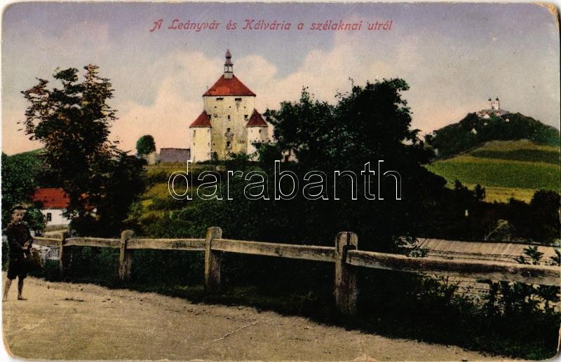 Selmecbánya, Schemnitz, Banska Stiavnica; Szélaknai út a Leányvárral és Kálváriával. Joerges kiadása és Ifj. Farkas Jenő amatőr felvétele / road with castle and calvary (kis szakadás / smmall tear)