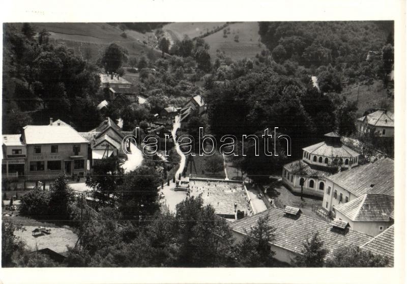Beschreibung: Szklenófürdő, Sklené Teplice; vendéglő, üzlet, medence / Hostinec, obchod / restaurant, shop, swimming pool