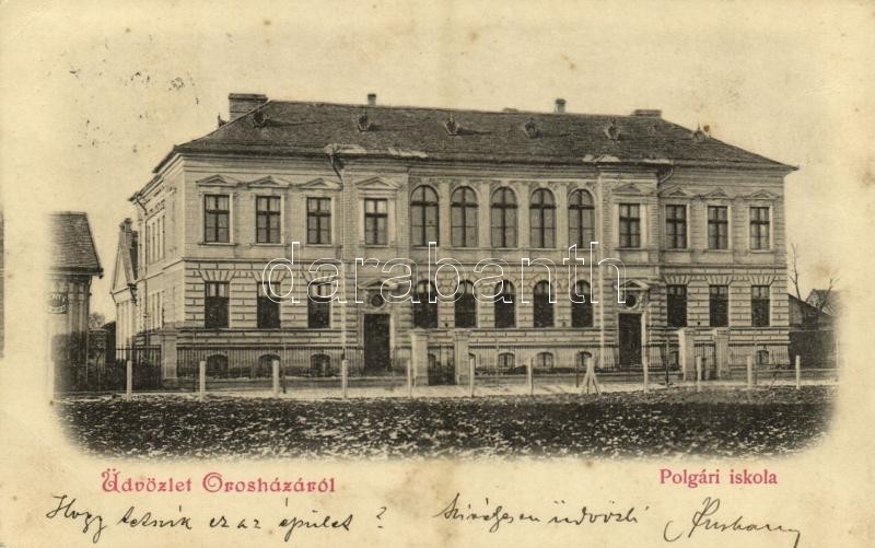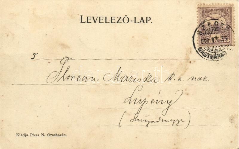 Beschreibung: 1900 Orosháza, Polgári iskola, könyvkereskedés üzlete. Kiadja Pless N. (fl)