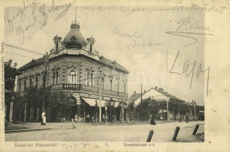 1905 Budapest XIX. Kispest, Takarékpénztár, Otthon vendéglő, étterem és kávéház, bor és sörcsarnok, csemege üzlet, villamos. Kiadja Fischhof Henrik könyvnyomdája (Rb)