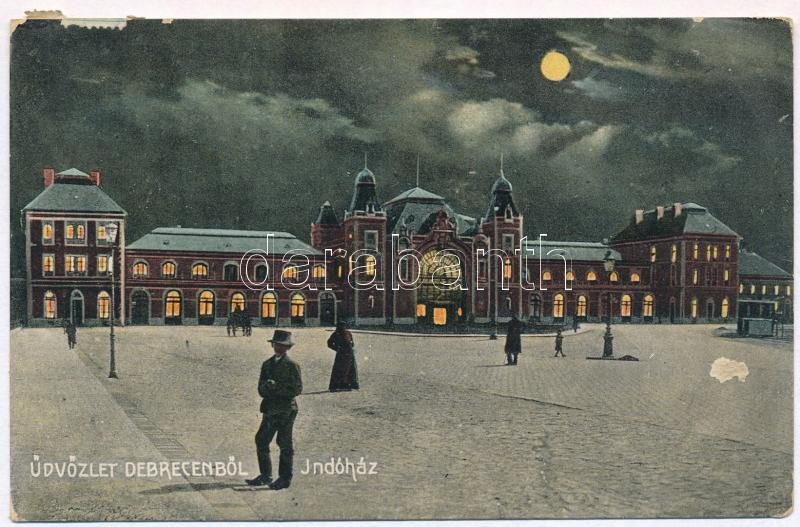 1913 Debrecen, Indóház, vasútállomás este holdfényben https://www.darabanth.com/de/358-Fernauktion/358.0/Ansichtskarten/Ungarn~1000004/1913-Debrecen-Indohaz-vasutallomas-este-holdfenyben~II1988668