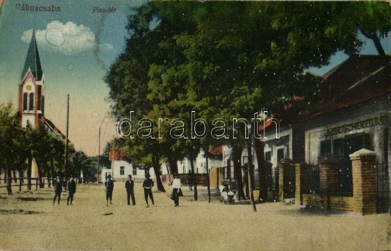 Beschreibung: 1923 Budapest XVII. Rákoscsaba, Piac tér, templom, Mózer György vendéglője