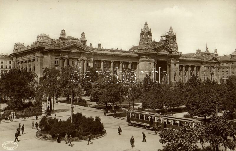 Beschreibung: Budapest V. Szabadság tér, Tőzsdepalota, villamos "öröklakás" hirdetéssel. Csiky Foto