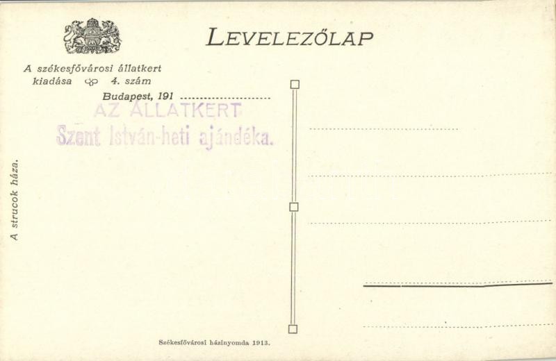 Beschreibung: Budapest XIV. Székesfővárosi Állatkert, a struccok háza + "Az Állatkert Szent István-heti ajándéka" bélyegzés