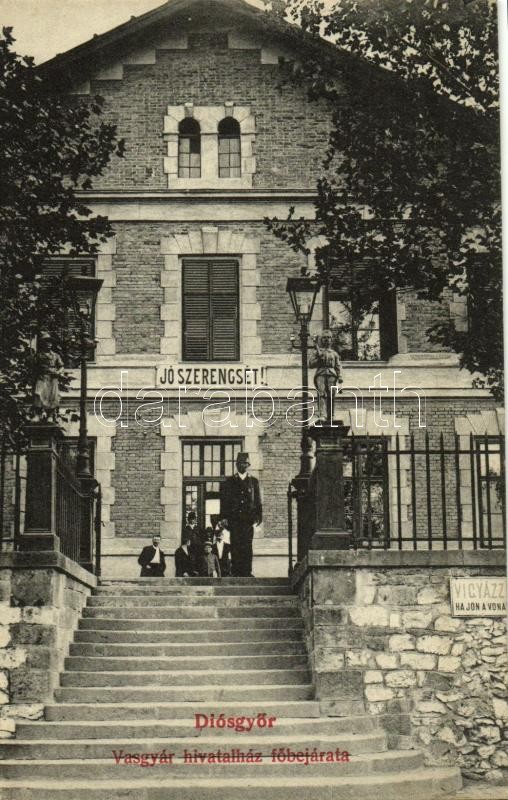 Beschreibung: Diósgyőr (Miskolc), Vasgyár hivatalház főbejárata "Jó szerencsét!" és "Vigyázz ha jön a vonat" táblákkal. Gedeon András kiadása