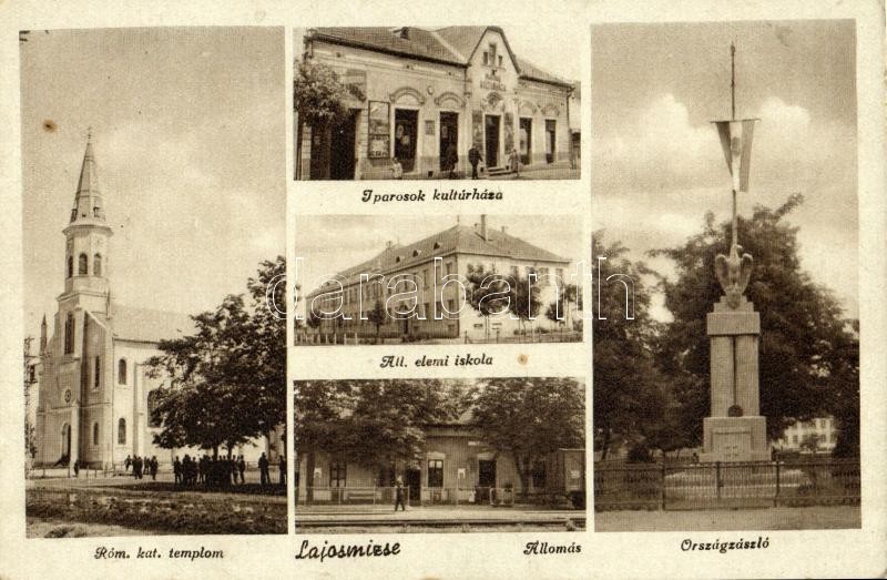 Beschreibung: Lajosmizse, Római katolikus templom, vasútállomás, állami elemi iskola, országzászló, Iparosok kultúrháza (EK)