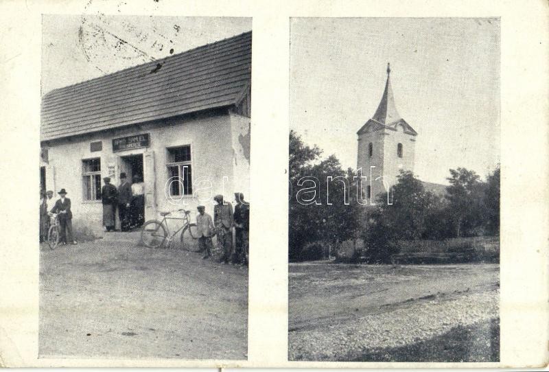Beschreibung: Vanyarc, Evangélikus templom, kerékpár, Apkó Sámuel üzlete és saját kiadása (EK)