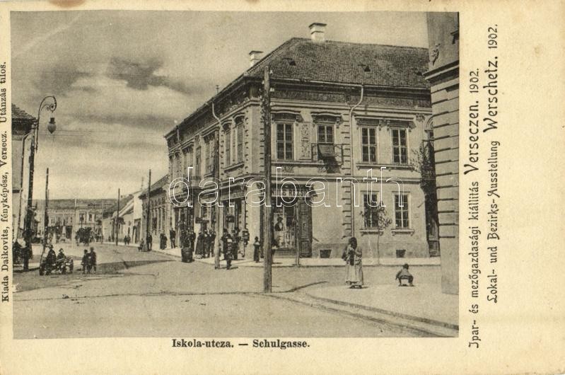 1902 Versec, Werschetz, Vrsac; iskola utca, Lendle Rezső üzlete. Ipar és mezőgazdasági kiállítás. Daikovits fényképész kiadása / Lokal- und Bezirks-Ausstellung / Industry and Agricultural Exhibition, street, shop