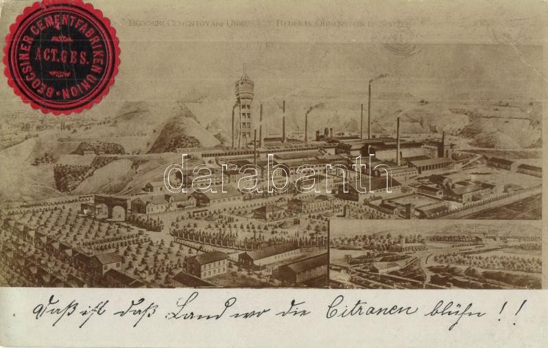 Beschreibung: 1908 Belcsény, Beocin; Cementgyári Unió, pecsét / cement factory, photo