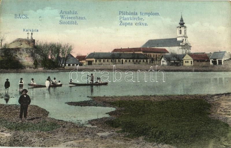 Beschreibung: Bács, Batsch, Bac; Árvaház, Plébánia templom, Kálvária, csónakosok / orphanage, calvary, church, boats (EK)