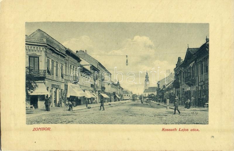 Beschreibung: Zombor, Sombor; Kossuth Lajos utca, Falcione Gyula üzlete. W.L. Bp. 3737. / street, shops