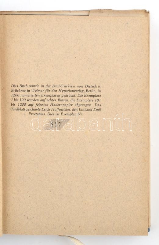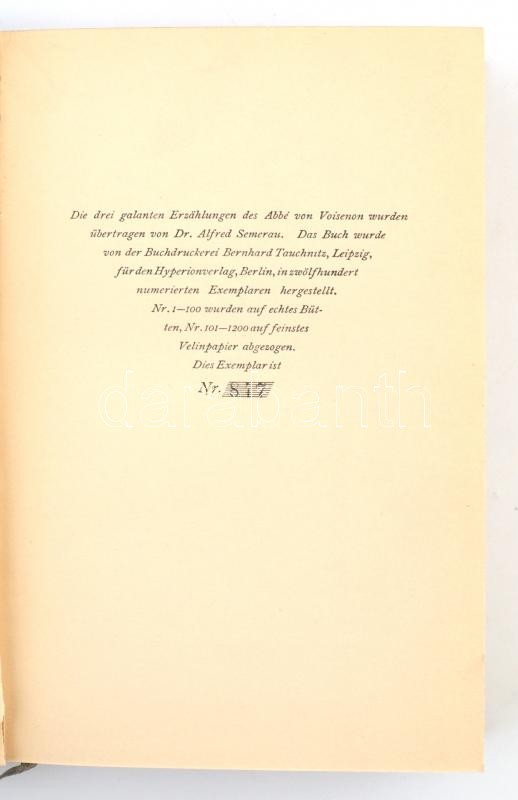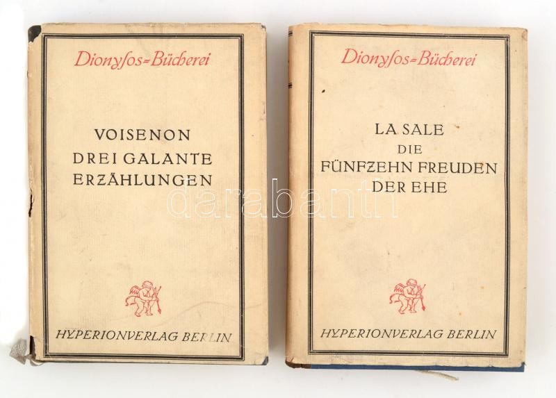 Dionysos Bücherei 2 kötete, német nyelven: Anthoine de la Sale: Die fünfzehn Freuden der Ehe. Számozott (1200/847.) példány.; Abbé von Voisenon: Drei Galante Erzählungen. Számozott (1200/847.) példány. Fekete-fehér képtáblákkal.; Berlin, én., Hyperionverlag. Kiadói aranyozott gerincű félbőr-kötésekben, kiadói kissé szakadt, kissé hiányos papír védőborítóban, aranyozott felső lapélekkel. / Half-leather-binding, in little bit damaged paper cover, in German language. 847. numbered copies.