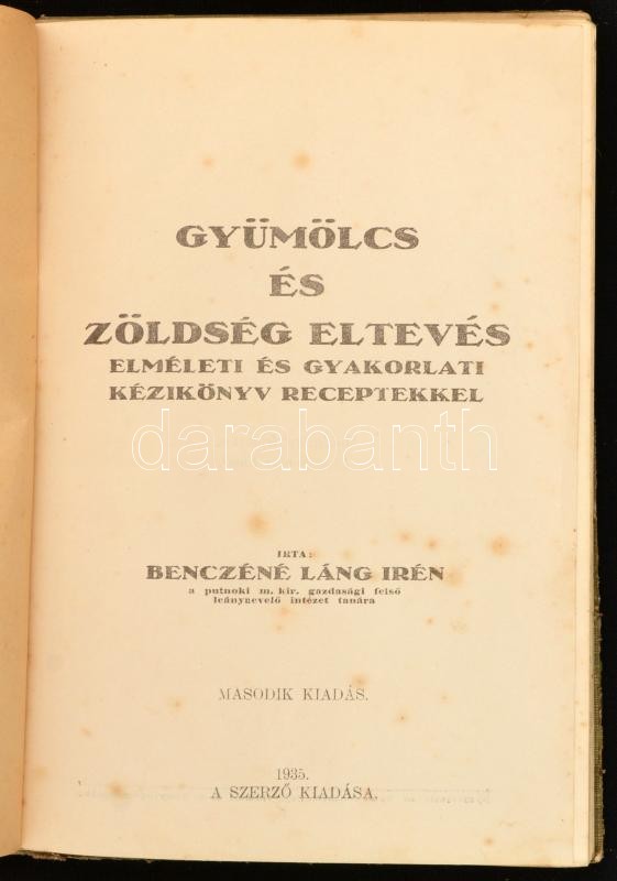 Benczéné Láng Irén: Gyümölcs és zöldség eltevés.. Bp., 1935. Szerzői. ... https://www.darabanth.com/de/358-Fernauktion/358.0/Bucher/Bucher-Gastronomie-und-Gartnerei~500046/Benczene-Lang-Iren-Gyumolcs-es-zoldseg-elteves-Bp-1935-Szerzoi-Kisse-serult-fC3~II2056490