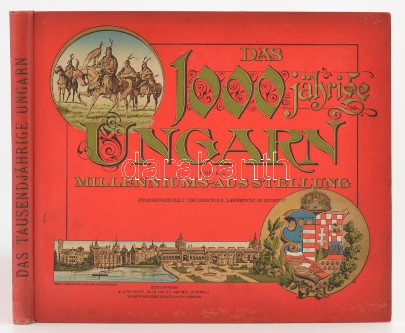 Az ezeréves Magyarország és a Milléniumi Kiállítás. Das 1000 jährige Ungarn und die Millenniums-Austellung. Magyarország legszebb tájainak, városainak és műkincseinek valamint a kiállítás nevezetességeinek fényképgyűjteménye. Részben Vágó Bertalan a M.Á.V. fényképésze. A kereskedelemügyi m. kir. ministerium pártfogása mellett, a m. kir. államvasutak és az ezredéves országos kiállítás igazgatóságának megbízásából és közreműködésével kiadja Laurencic Gyula. Szerkesztik: Piványi Ernő a magyar és német, Timár Szaniszló a magyar, Palóczy Lipót a német, Fouquau Henrik a francia, Vidéky László az angol szöveget. [Magyar, német, angol és francia nyelven.] Bp., 1896. Kunossy Vilmos és Fia, 4+192+2 p. Kiadói aranyozott egészvászon-kötés, kis kopásnyomokkal.