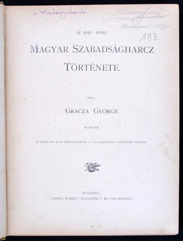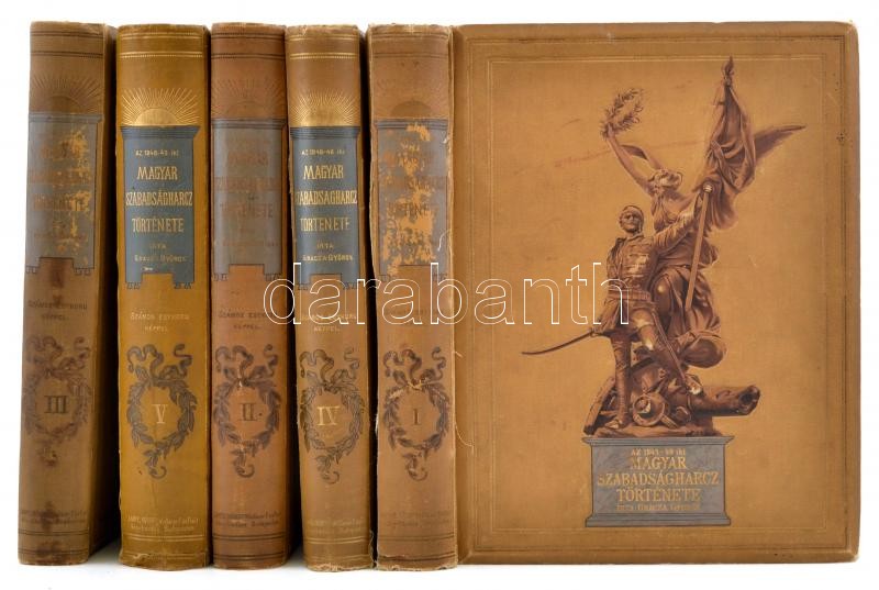Gracza György: Az 1848-49-iki magyar szabadságharc története. I-V. kötet. Bp.,(1894),Lampel R. (Wodianer F. és Fiai.) Számos fekete-fehér és színes illusztrációkkal, litografált táblákkal, hasonmás mellékletekkel. Kiadói aranyozott egészvászon-kötés, kopott borítókkal, az V. kötet fűzése sérült, laza, a lapok kijárnak, az I. kötet gerince kissé sérült.