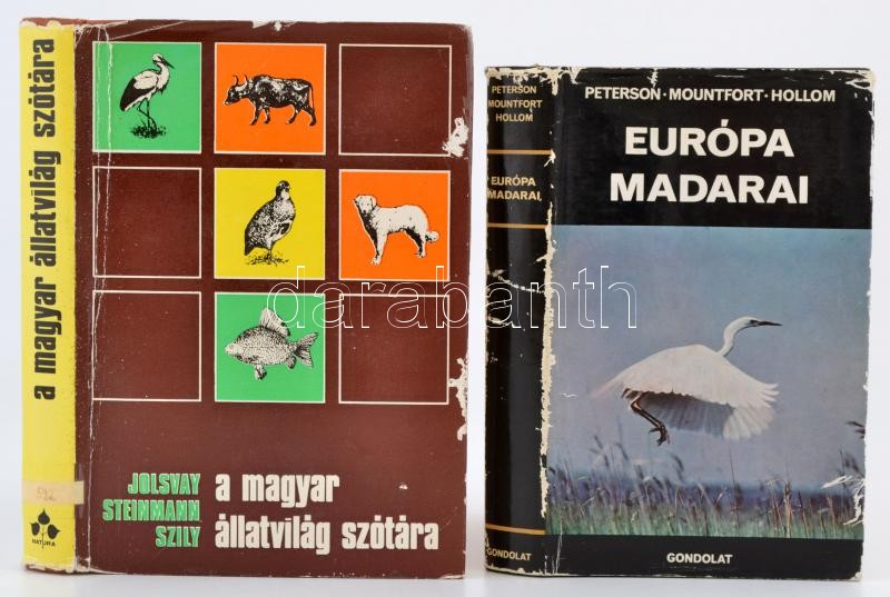 2 db könyv: Peterson - Mounfort - Hollom: Európa madarai. Bp., 1969, Gondolat; Jolsvay - Steinmann - Szily: A magyar állatvilág szótára. Bp., 1977, Natura. Egészvászon kötés, papír védőborítóval, kötetenként változó állapotban.