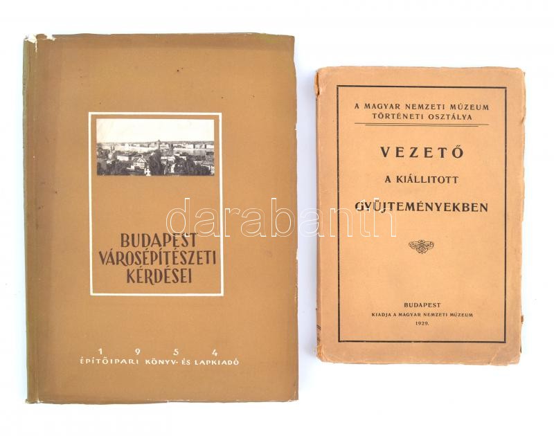 1929-1954 Budapest városépÃtészeti kérdései. Az 1953. nov. 20-21.-én tartott ankét anyaga. Szerk.: Preisich Gábor, Sós Aladár, Brenner János. Bp., 1954, ÉpÃtésügyi Kiadó. Kiadói papÃrkötés, kissé szakadozott borÃtószélekkel. Megjelent 600 példányban.+Magyar Nemzeti Múzeum történeti osztálya vezetÅ‘ a kiállÃtott gyűjteményekben. Összeáll.: Varjú Elemér. Bp., 1929, MNM. Kiadói papÃrkötés, szakadozott borÃtóval.