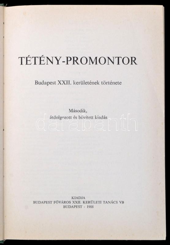 Tétény-Promontor. Bp. XXII. kerületének története. Szerk.: Joó Ernő, Dr. Tóth Gábor. Bp., 1988, Budapest Főváros XXII. Kerületi Tanács VB, 524 p Második, átdolgozott, és bővített kiadás. Fekete-fehér fotókkal illusztrálva. Kiadói egészvászon-kötés,