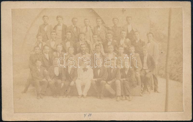 Beschreibung: 1874 Budapest, II. ker. Állami Főreáltanoda V. b. osztálya, vizitkártya méretű csoportkép (ritka ebben a méretben és ebben az időszakban), 6,5x10,3 cm