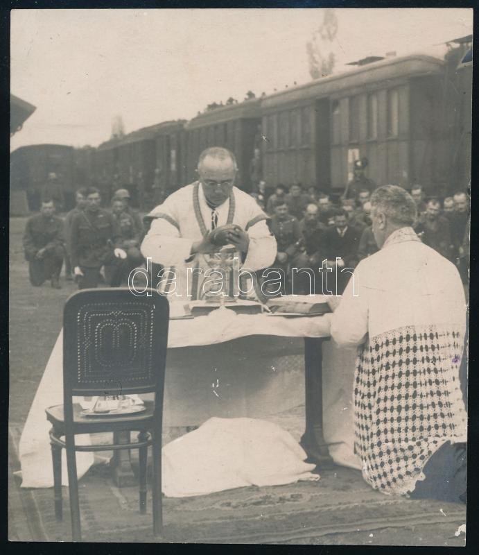 Beschreibung: 1921 Mise celebrálása a biatorbágyi vasútállomáson IV. Károly király visszatérési kísérlete idején, 13×11 cm
