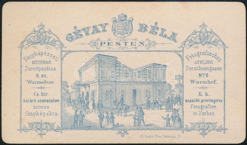 Beschreibung: Gévay Béla Pesten, műtermét ábrázoló verzójú keményhátú fotó rajzos verzóval