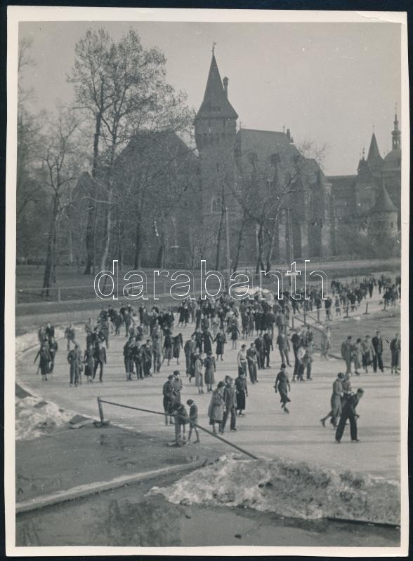 Beschreibung: cca 1931 Kinszki Imre (1901-1945) budapesti fotóművész hagyatékából, jelzés nélküli vintage fotó (Városligeti-tó korcsolyapálya), 15,8x11,6 cm