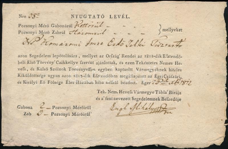 Beschreibung: 1812 Eger, nyugtató levél gabona és zab beszolgáltatásáról