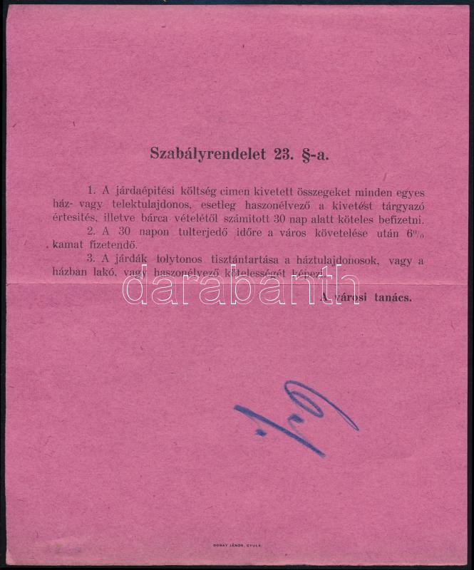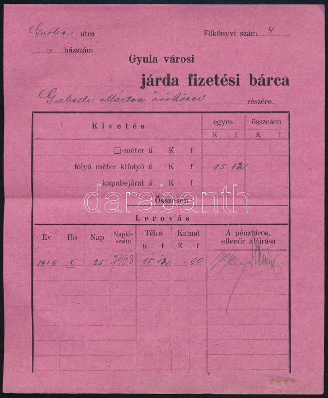 cca 1900 Gyula város járda fizetési bárca https://www.darabanth.com/de/358-Fernauktion/358.0/Kunst-Dokumente-andere-Sammelgebiete/Dokument~500019/cca-1900-Gyula-varos-jarda-fizetesi-barca~II2055231