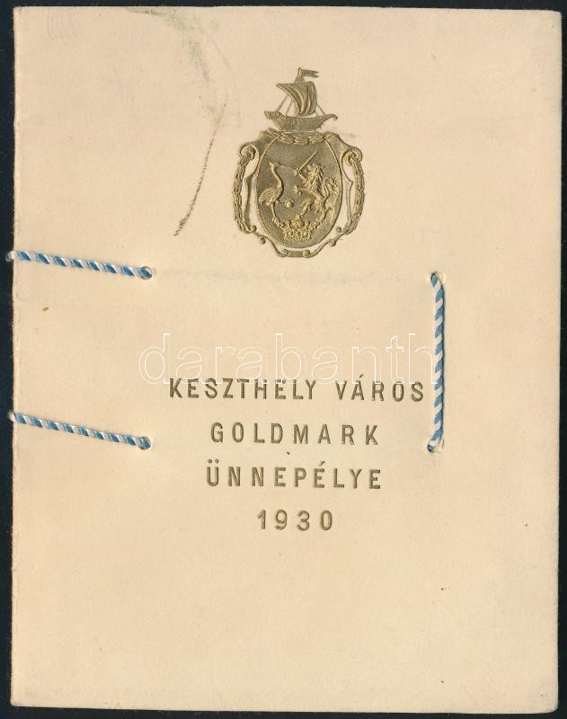 1930 Keszthely város Goldmark ünnepélye. 31p. Képekkel. Zsinórfűzott, ... https://www.darabanth.com/de/358-Fernauktion/358.0/Kunst-Dokumente-andere-Sammelgebiete/Drucksachen~500034/1930-Keszthely-varos-Goldmark-unnepelye-31p-Kepekkel-Zsinorfuzott-dombornyomott-papirborC3~II2034820