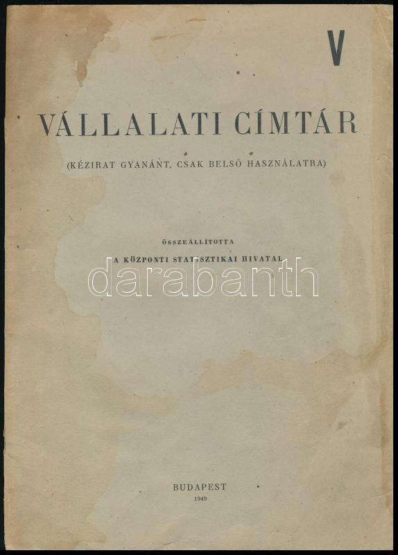 1949 Vállalati címtár. Összeáll.: KSH. Bp., 1949, Stephaneum, 99 p. Pa... https://www.darabanth.com/de/358-Fernauktion/358.0/Kunst-Dokumente-andere-Sammelgebiete/Drucksachen~500034/1949-Vallalati-cimtar-Osszeall-KSH-Bp-1949-Stephaneum-99-p-Papirkotesben-foltos-B~II2058141