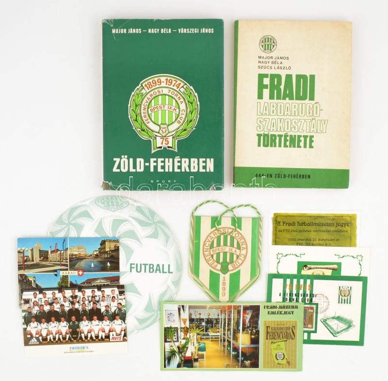 Beschreibung: Vegyes FTC (Ferencváros) tétel: Zöld-fehérben, Fradi labdarúgó-szakosztály története, képeslapok, asztali díszzászló, stb., összesen 9 db
