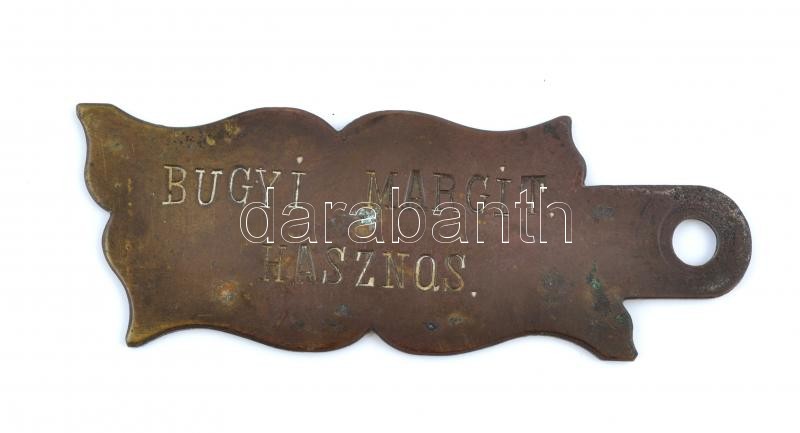 Beschreibung: cca 1910 Szecessziós formájú réz kerékpár-tulajdonosi tábla, Bugyi Margit - Hasznos névre, 4,5×13,5 cm