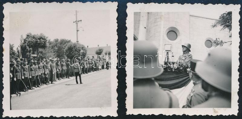 Beschreibung: 1939 Veszprémi hősi emlékmű avatása. József főherceg beszédet mond, sorakozó katonák, 2 feliratozott fotó, Regényi fotó, 9x9 cm