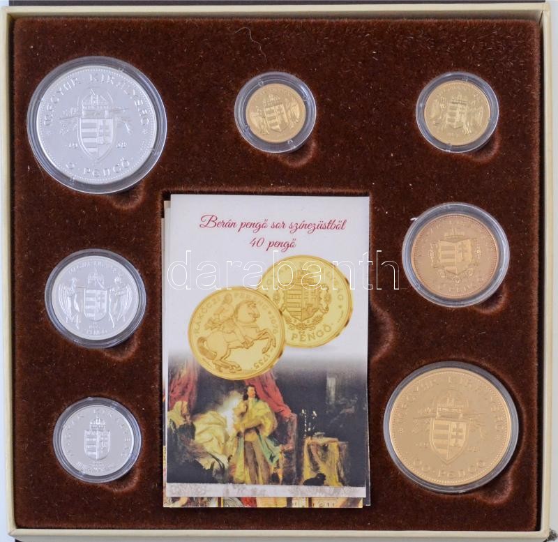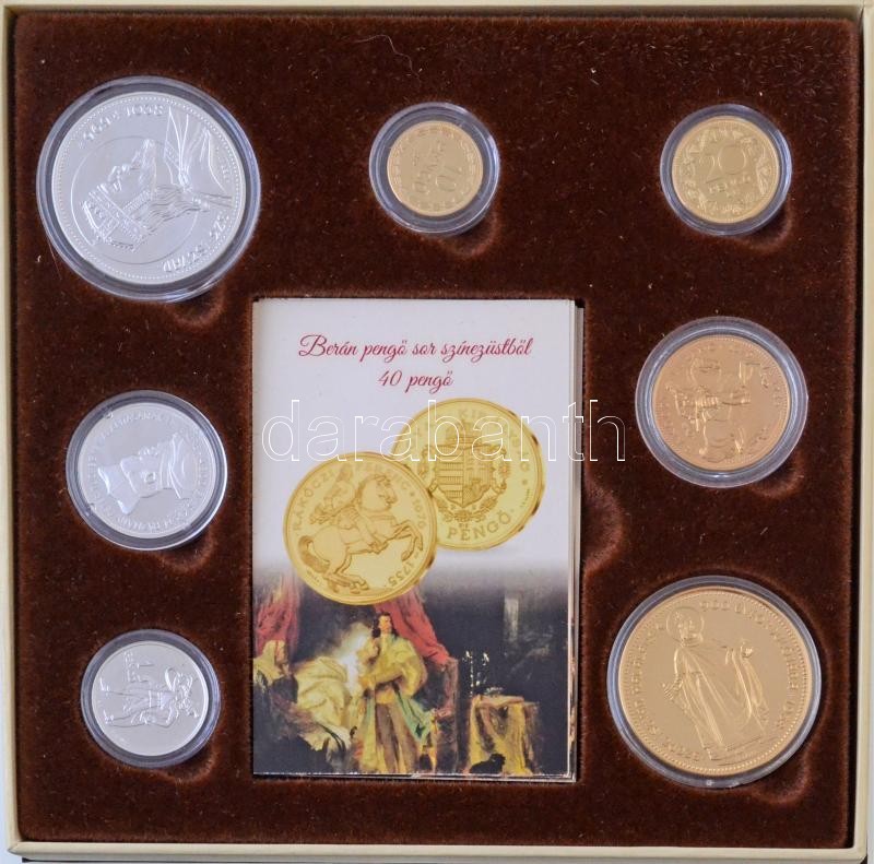 DN "Berán Pengő Sor színezüstből" a Berán Lajos által tervezett pengő pénzérmék Ag és aranyozott Ag utánveretei (7xklf), tanúsítvánnyal díszdobozban (összsúly: 89,9g/0.999) T:PP