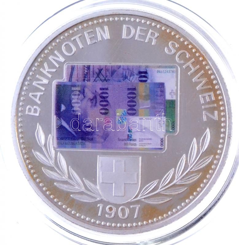 Svájc DN "Banknoten der Schweiz 1907 / Billets de Banque de Suisse - Banconote della Svizzera" ezüstözött Cu-Ni emlékérem 1000Fr svájci bankjegy multicolor képével (40mm) T:PP Switzerland ND "Banknoten der Schweiz 1907 / Billets de Banque de Suisse - Banconote della Svizzera" silver plated Cu-Ni commemorative medallion with the multicolor image of 1000 Francs banknote (40mm) C:PP