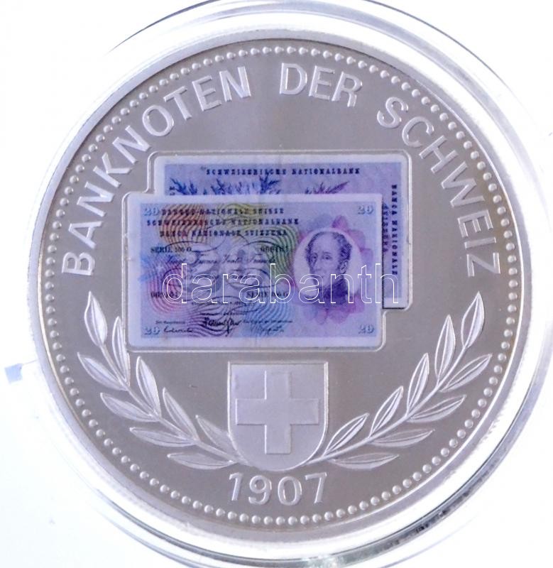 Svájc DN "Banknoten der Schweiz 1907 / Billets de Banque de Suisse - Banconote della Svizzera" ezüstözött Cu-Ni emlékérem 20Fr svájci bankjegy multicolor képével, tanúsítvánnyal (40mm) T:PP Switzerland ND "Banknoten der Schweiz 1907 / Billets de Banque de Suisse - Banconote della Svizzera" silver plated Cu-Ni commemorative medallion with the multicolor image of 20 Francs banknote, with certificate (40mm) C:PP