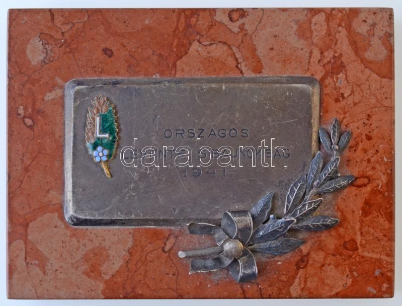 Beschreibung: 1941. "Országos Levente Síbajnokság 1941" jelzett Ag lemezplakett márványlapon, zománcozott Levente jelvény rátéttel (~65x89mm) T:2 sérült zománc