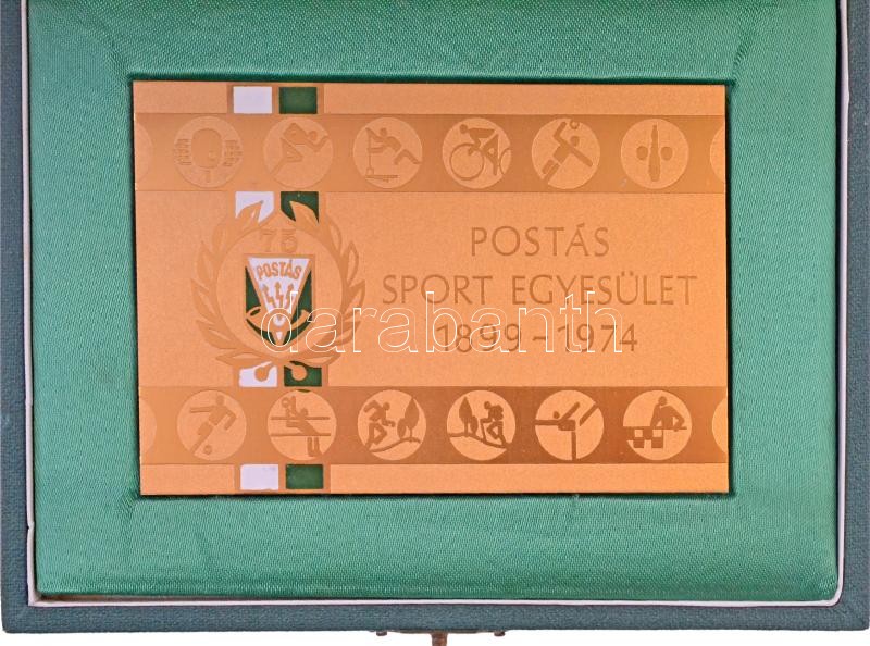 Beschreibung: DN "Postás Sport Egyesület 1899-1974" aranyozott fém(?) plakett (99x67mm) + "Postás 75 év" zománcozott jelvény (16x15mm) zöld díszdobozban T:1-,2