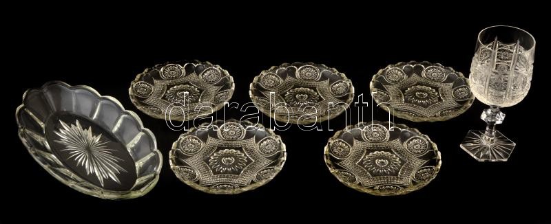 Beschreibung: Formába préselt tál 23×13,5 cm, tálkák (5 db), d:14 cm egyiken csorbával, talpas ólomkristály csiszolt pohár, m: 15,5 cm