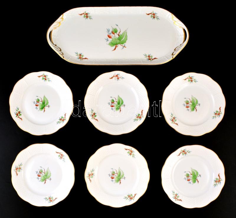 Beschreibung: Herendi csipkebogyó mintás szendvicses készlet, 6+1 db tányér, kézzel festett, jelzett (tanuló), apró kopásokkal, d: 19 cm, 36×15 cm