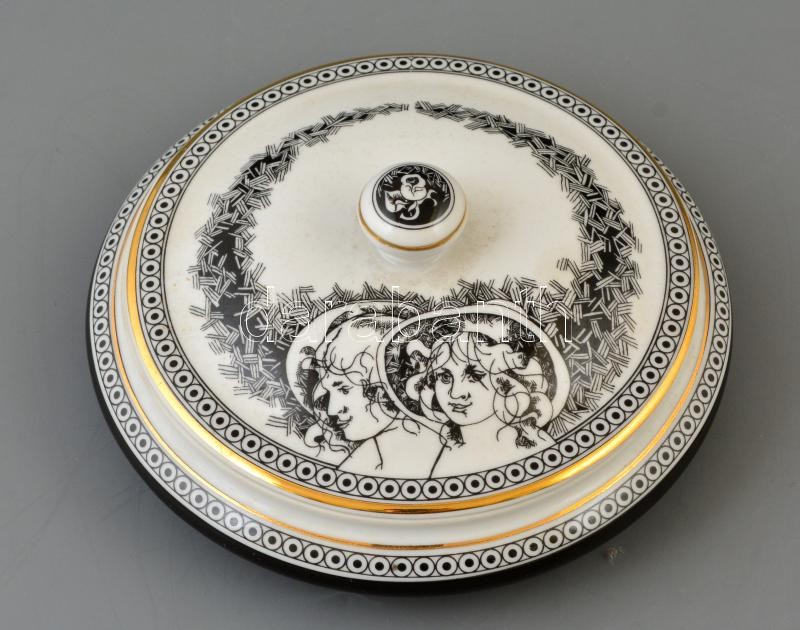 Beschreibung: Hollóházi Jurcsák László által tervezett mintával díszített porcelán bonbonier, matricás, jelzett, hibátlan, d: 16 cm