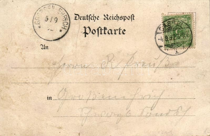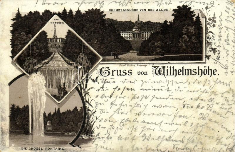 Beschreibung: 1892 (Vorläufer!!!) Kassel, Cassel; Wilhelmshöhe von der Allee, Die grosse Fontaine, Schloss, Das Oktagon / castle, fountain. Art Nouveau, floral, litho (EB)
