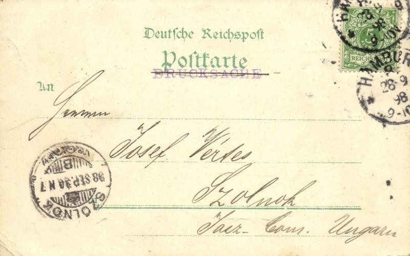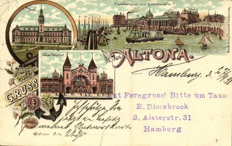1898 Altona (Hamburg), Post, Fischereihafen und Auctionshalle, Neuer Bahnhof / post office, fishing port, auction hall, railway station. Kunstanstalt Rosenblatt 2481. Art Nouveau, floral, litho (EK)
