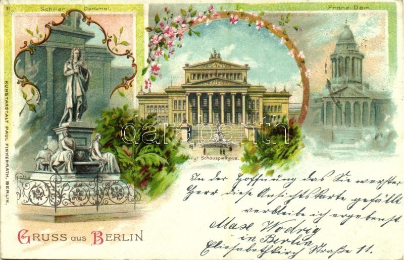 Beschreibung: 1898 Berlin, Franz. Dom, Schiller Denkmal, Königl. Schauspielhaus / cathedral, monument, theatre. Kunstanstalt Paul Finkenrath 51. Art Nouveau, floral, litho