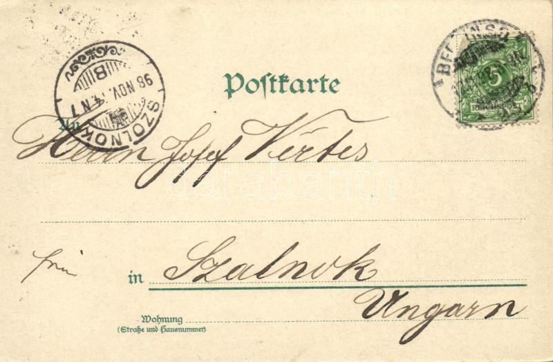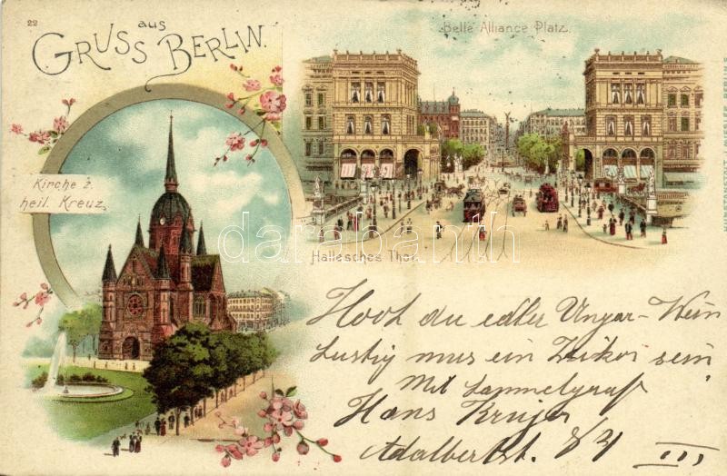 Beschreibung: 1898 Berlin, Hallesches Thor, Belle Alliance Platz, Kirche z. heil. Kreuz. / street view, tram, church. Kunstanstalt J. Miesler 22. Art Nouveau, floral, litho (EK)