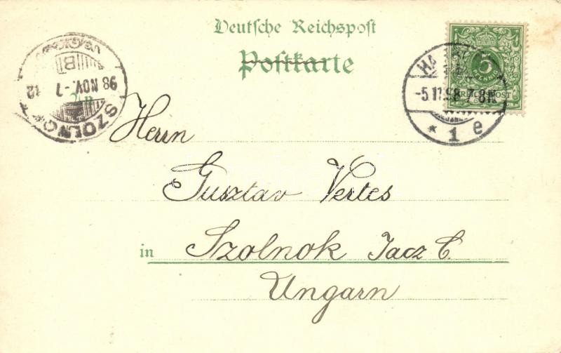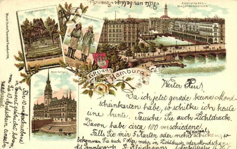 1898 Hamburg, Alsterarkaden u. Reegendammbrücke, Neues Rathaus, Kriegerdenkmal, Helgoländer / bridge, monument, town hall, Helgoland folklore, coat of arms. Kunstanstalt Rosenblatt Art Nouveau, floral, litho