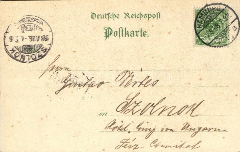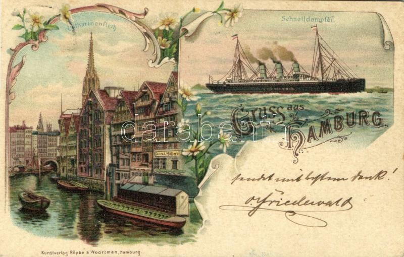 Beschreibung: 1898 Hamburg, Schnelldampfer "Normannia", Catharinenfleet. Kunstverlag Röpke & Woortman. Art Nouveau, floral, litho